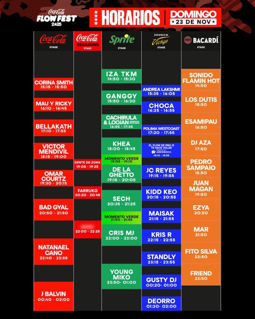 El domingo 23 de noviembre arribará J Balvin, Young Miko, Nicky Jam, Bad Gyal, Cris MJ, Omar Courtz, Sech, María Becerra, De la ghetto, Deorro, Khea, Kidd Keo, Mau y Ricky, Victor Mendívil, JC Reyes, Kris R., Juan Magan, Jory Boy, Standly, Corina Smith, Ganggy, L-Gante, Maisak, Pedro Sampaio, ADSO, Dj Aza, Iza TKM, Polimá Westcoast, Esamipau, MAR y como invitado especial Natanael Cano.