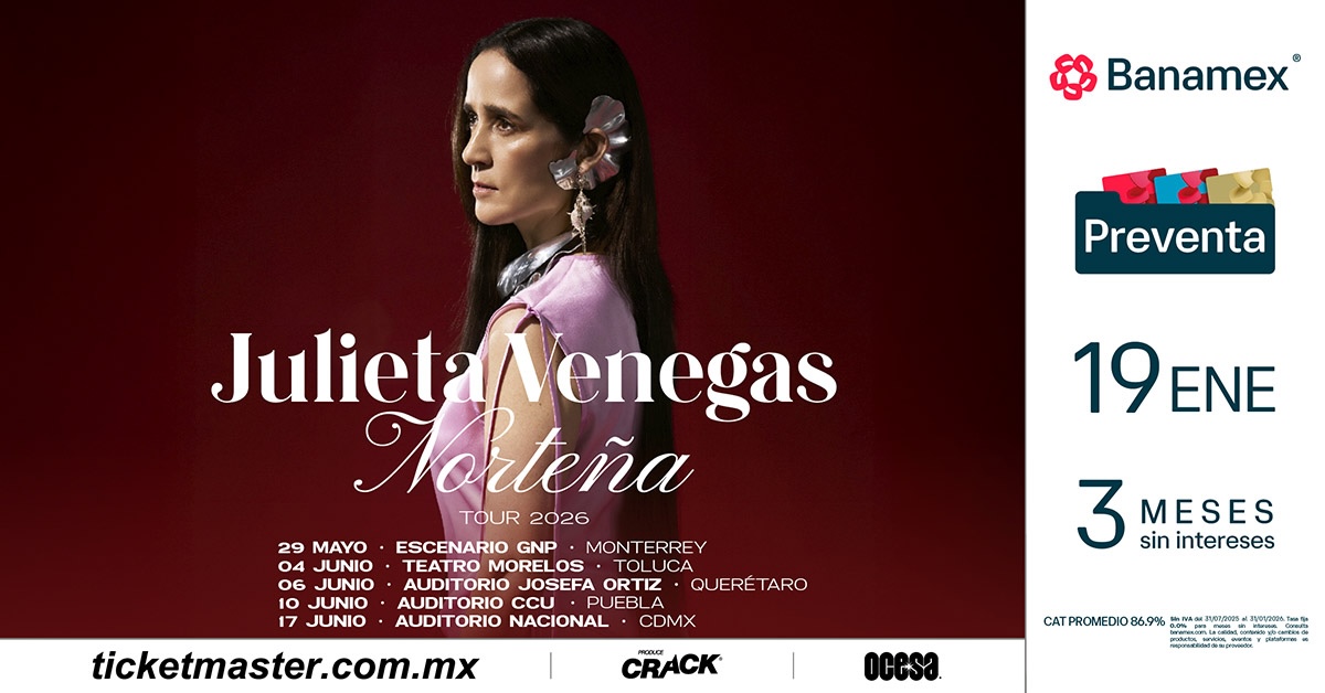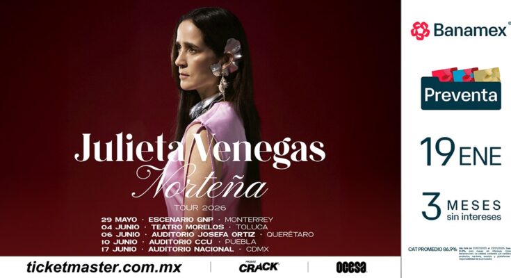 Julieta Venegas ofrecerá a sus fans noches increíbles con esta gira que llevará lo mejor de su música a la capital del país y el interior de la República Mexicana. La preventa Banamex será el 19 de enero (para CDMX y MTY) a través de Ticketmaster; en el caso de Toluca, Puebla y Querétaro, los boletos estarán en E-Ticket. Un día después, se podrán adquirir en la venta general.