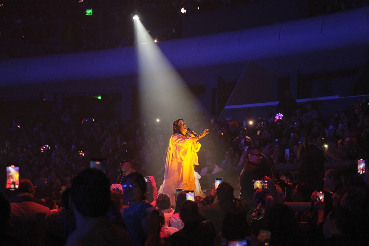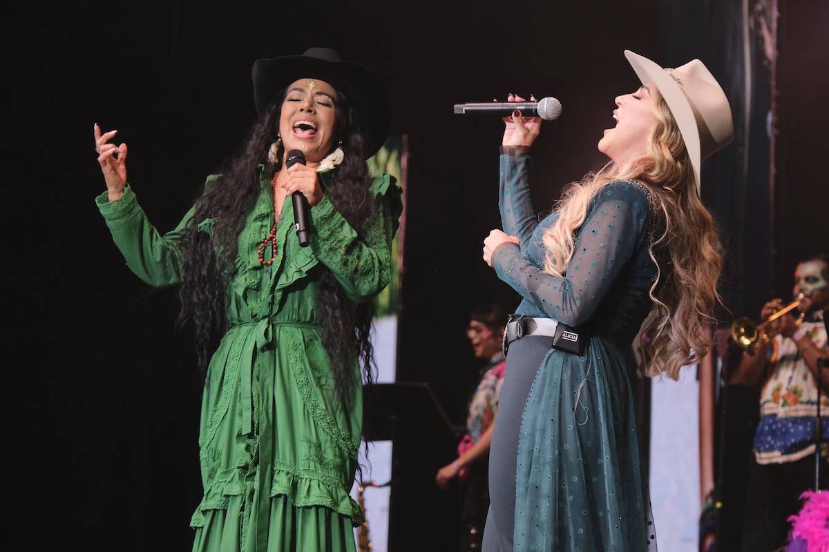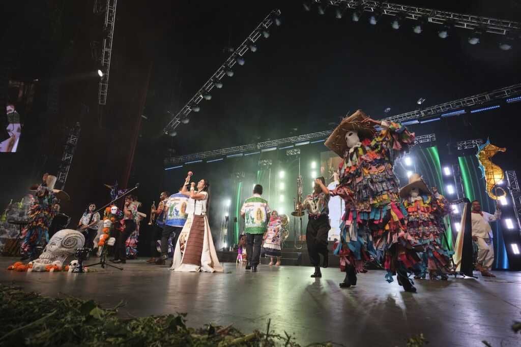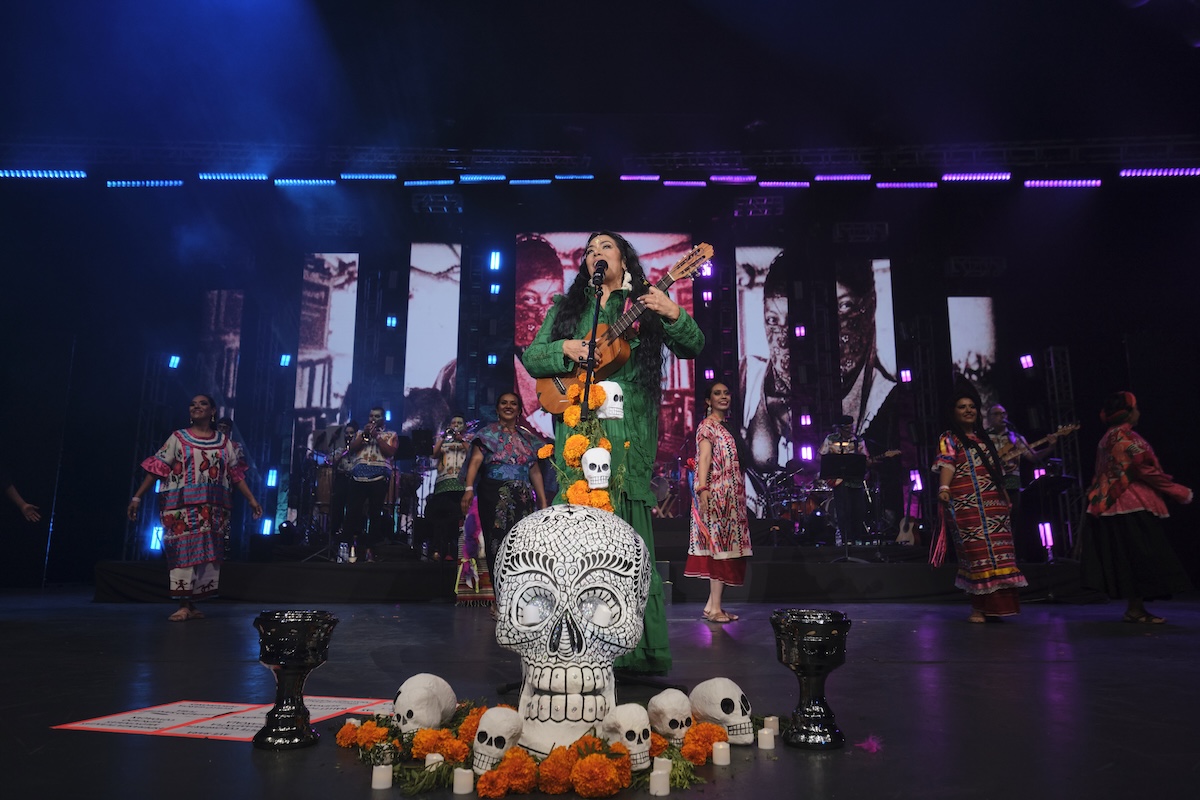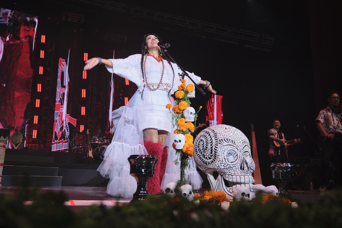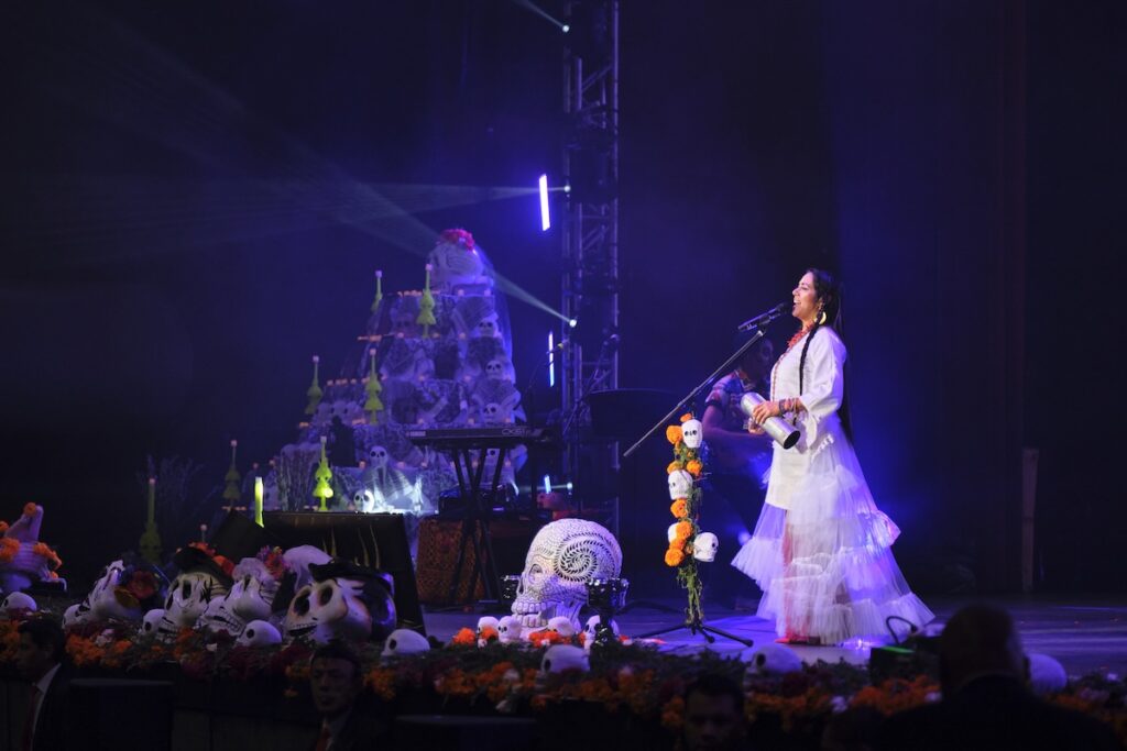 La cantautora y activista conocida artísticamente como “La Reina Mixteca” emergió en una colorida producción, extendiendo al frente del escenario flores de cempasúchil, calaveritas y veladoras honrando a los difuntos en emotiva celebración entonando “Icnocuicatl”.
