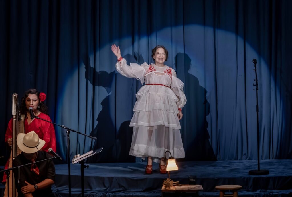 Dedicó a las infancias “Pajarito colibrí” y sobrevoló hacia “María la Curandera”. Convidó a escena al cantautor sinaloense David Aguilar al rasgar de “Cómo quisiera quererte”, “Soledad y el mar” y “El coconito”, incluyendo “El palomo y la negra”.