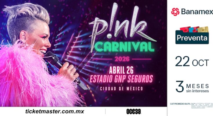 La cantante, intérprete, icono del pop internacional y ganadora de tres premios Grammy, P!NK, anuncia hoy su esperado show en México. La gira “Carnival Tour” llegará al Estadio GNP Seguros de la Ciudad de México, el próximo 26 de abril de 2026.
