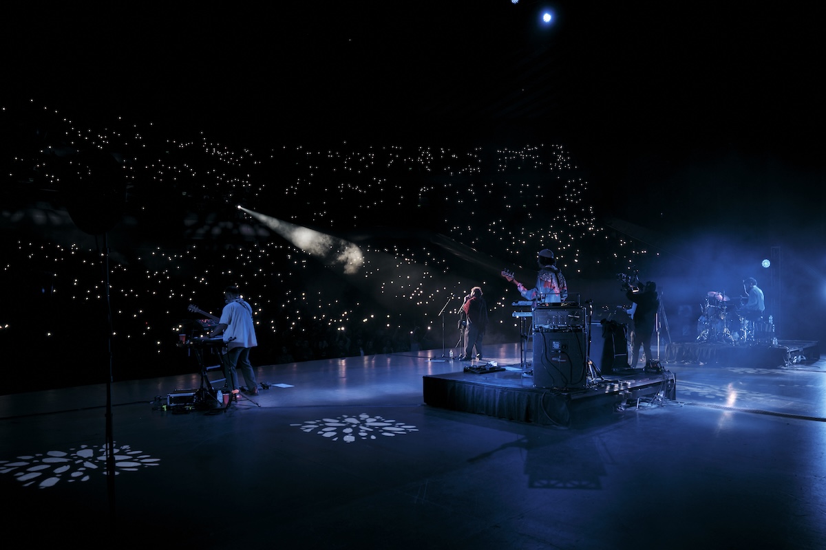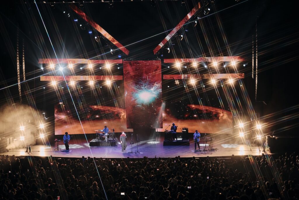 Entre luces multicolores surcando el horizonte, la reluciente producción diseñó atmosferas astrales proyectadas a telón de fondo en lienzos de arte digital alucinantes destellando en las miradas. Adicionalmente las plasmas laterales daban visibilidad a los músicos en acción.