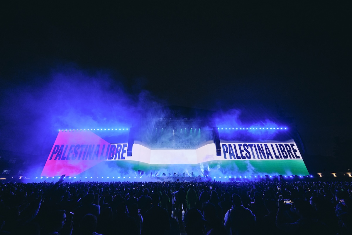 Filmaciones históricas de la banda brindaron una revisión desde sus inicios, siendo distinguidas por las multitudes. La velada avanzó resonando “Paula”, “Triste Sister” y “Paz”, extendiéndose en la plasma el mensaje directo “Palestina Libre” con su bandera fondeándose, aclamando la acción los presentes.