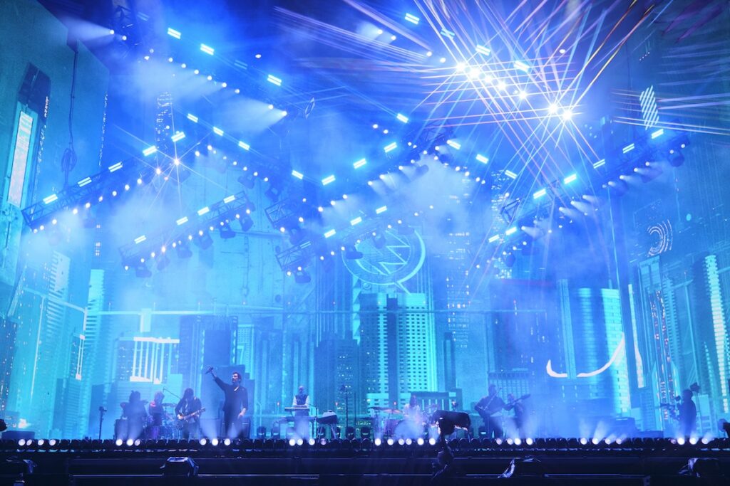 Brillante producción diseñó un viaje alucinante. Una colosal pantalla a telón de fondo se extendía en el horizonte del insigne inmueble de la alcaldía Iztacalco. Proyecciones futuristas figuraron un paseo en el cosmos, confabularon visualmente cada corte, entre luces coloridas y láser flotando en el espacio.